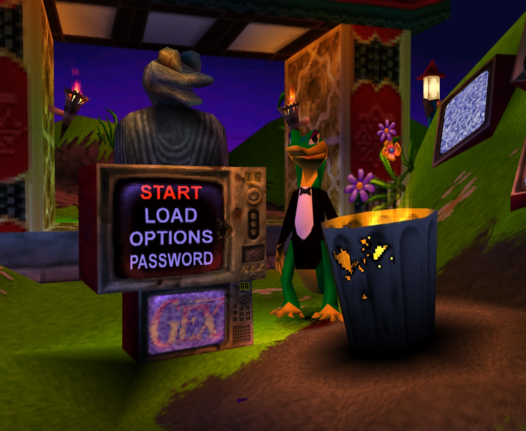 Gex is full of personality in a neat, spongy way that I’ve never run into before with any of the other “mascot characters” of this era. References are definitely common in media, a more self-aware and perhaps “lower-level” parallel to something like incorporation of motifs throughout one’s career in creative arts.